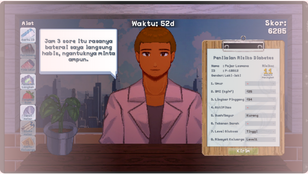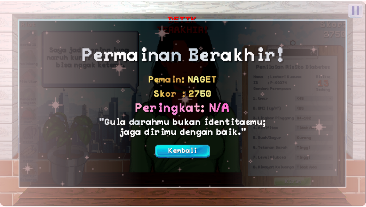 Pemain akan menyelesaikan berbagai minigame interaktif yang mensimulasikan proses diagnosis diabetes secara singkat namun informatif, mulai dari registrasi pasien hingga analisis hasil medis.